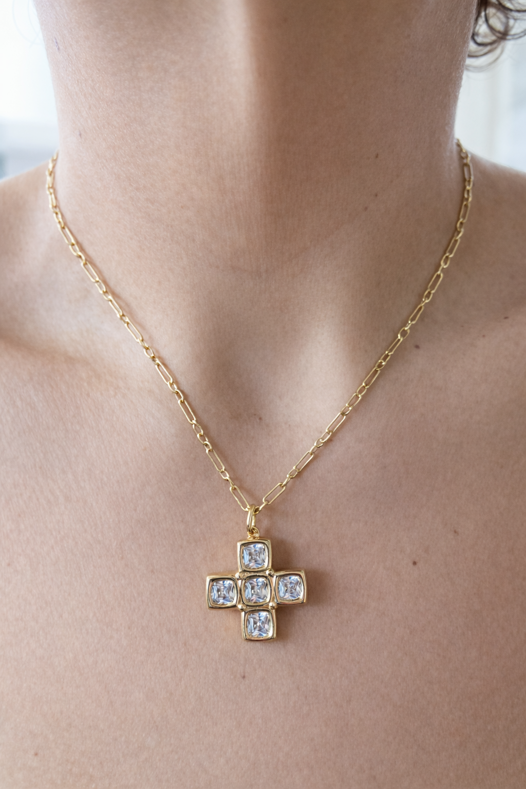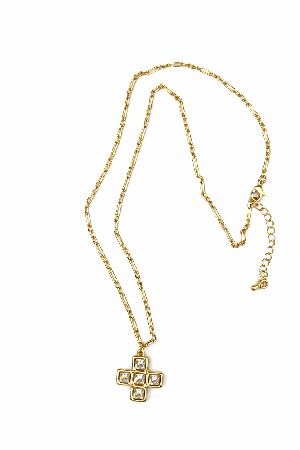 18k rack plated brass and cubic zirconia. Chain measures 16” long with 1” chain extender.