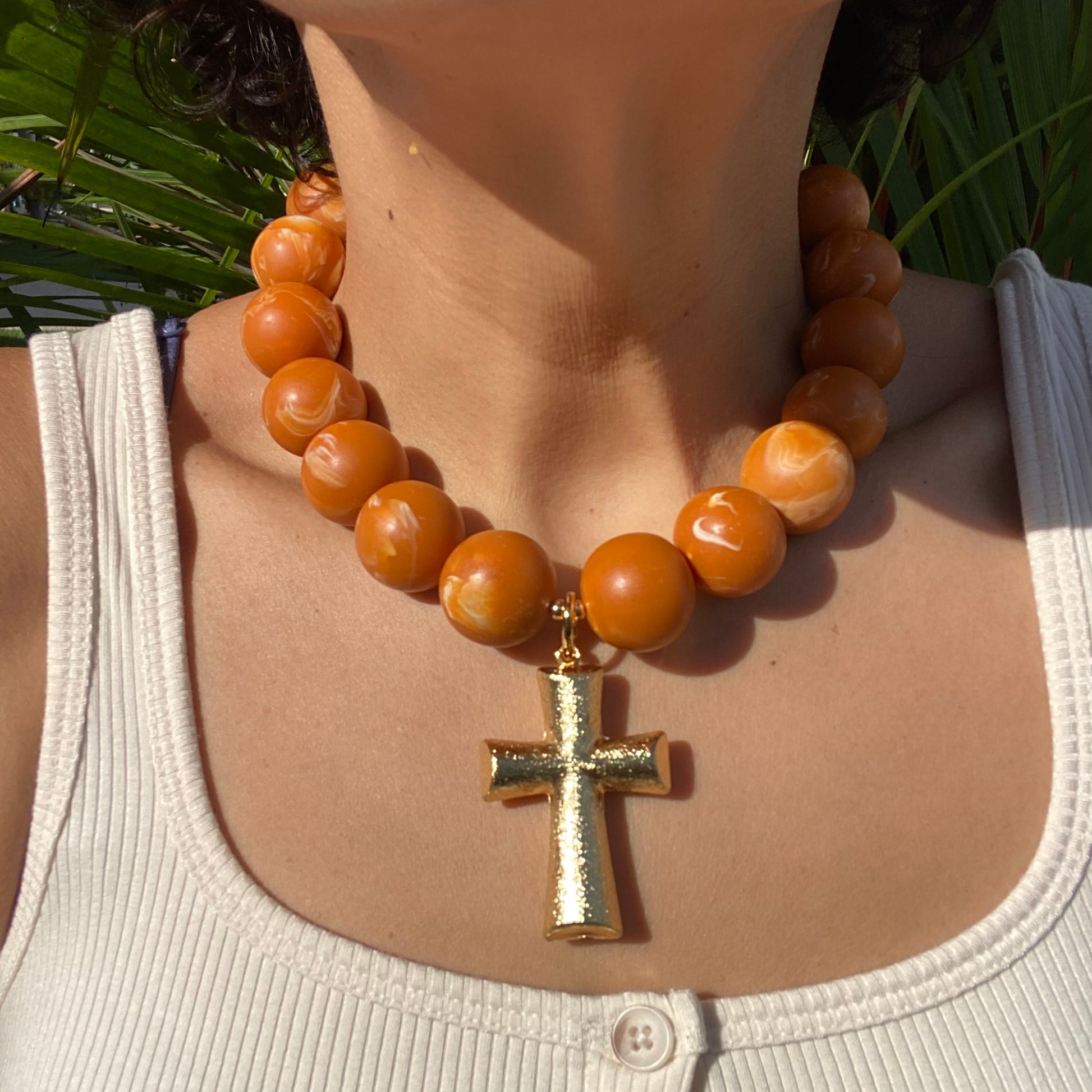 Resin Beads and 18k rack plated cross pendant, Measures 16.5” Long with 2” Chain Extender.