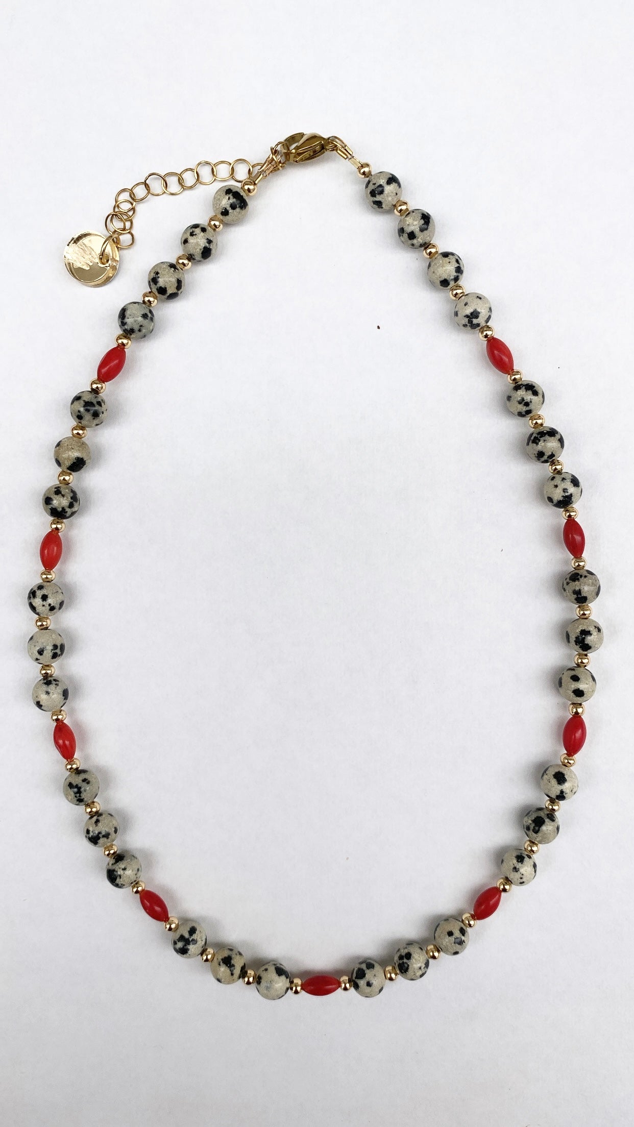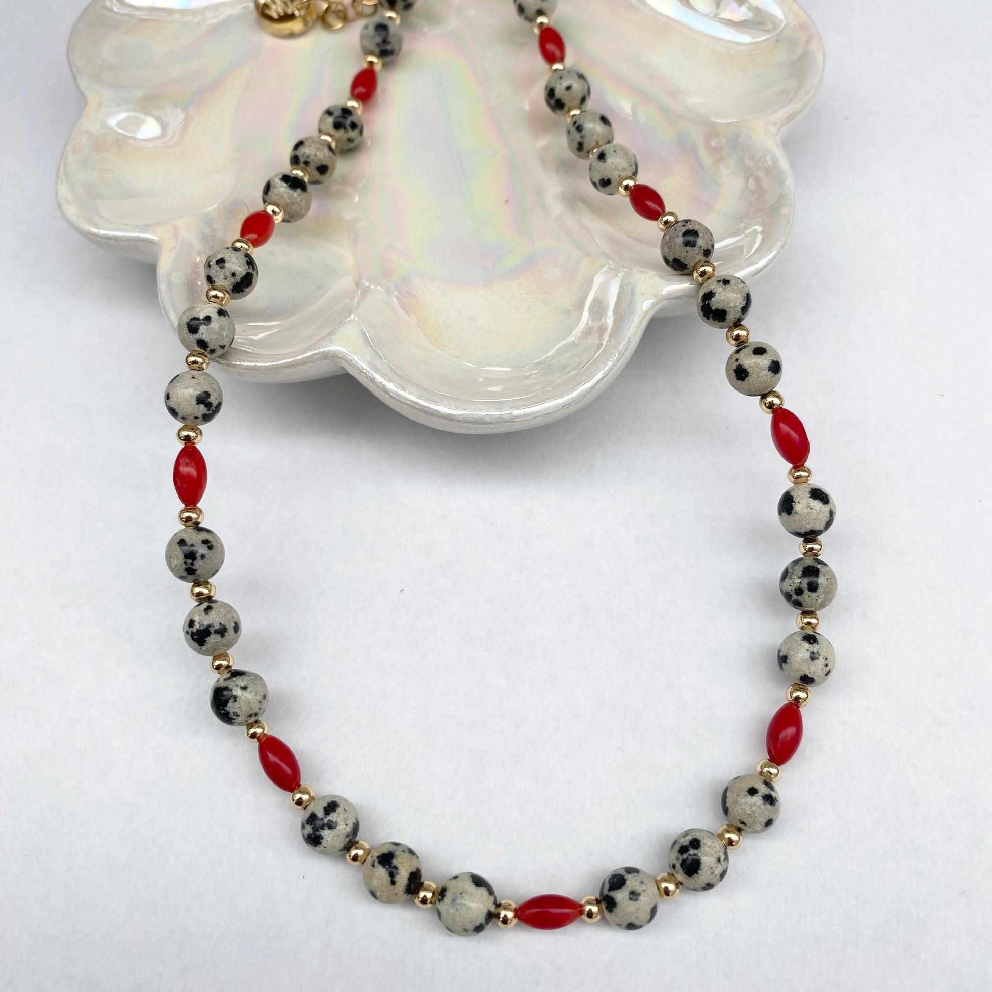 Natural Dalmatian Jasper and Coral, Measures 15.5” Long with 2” Chain Extender.