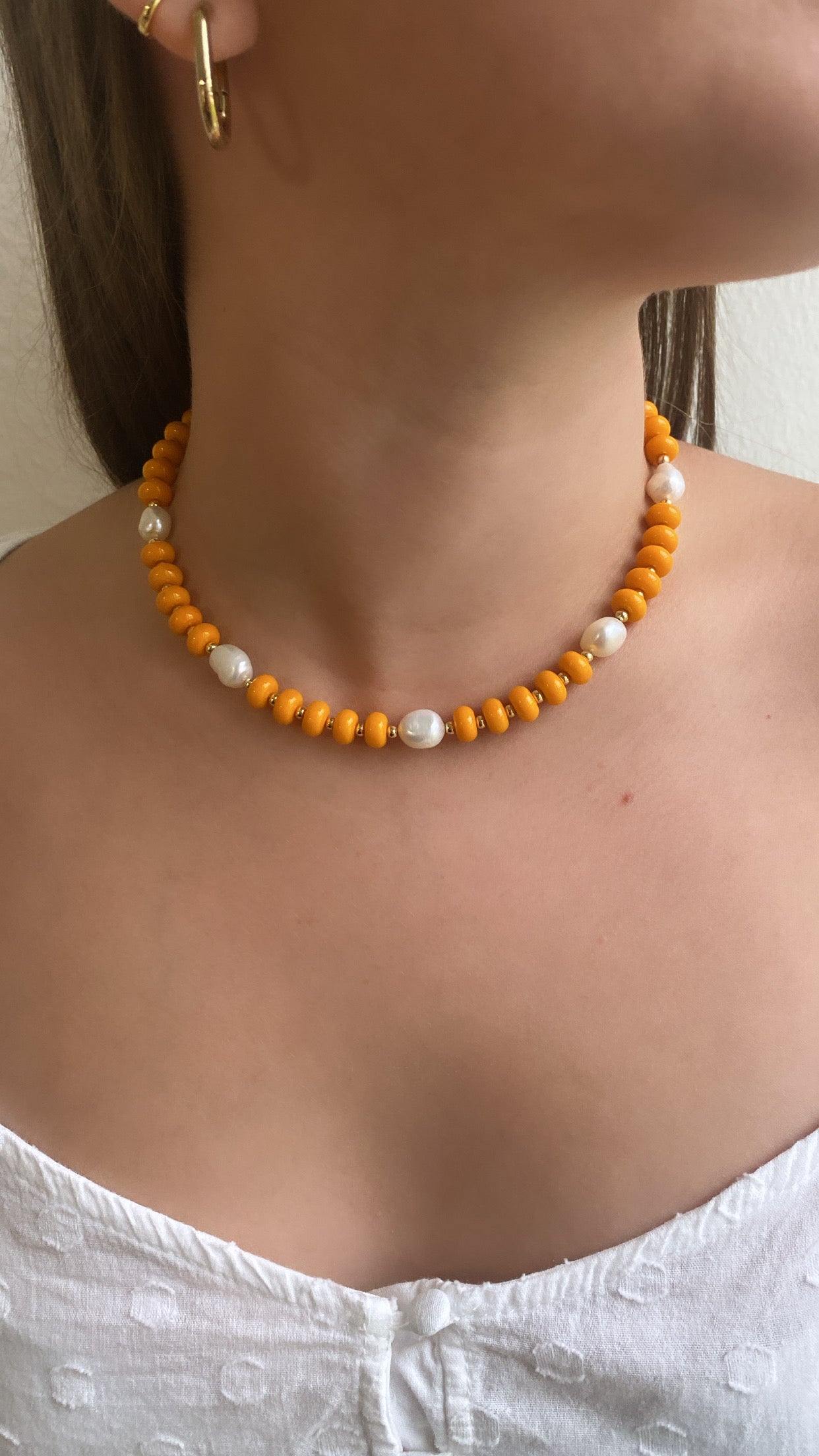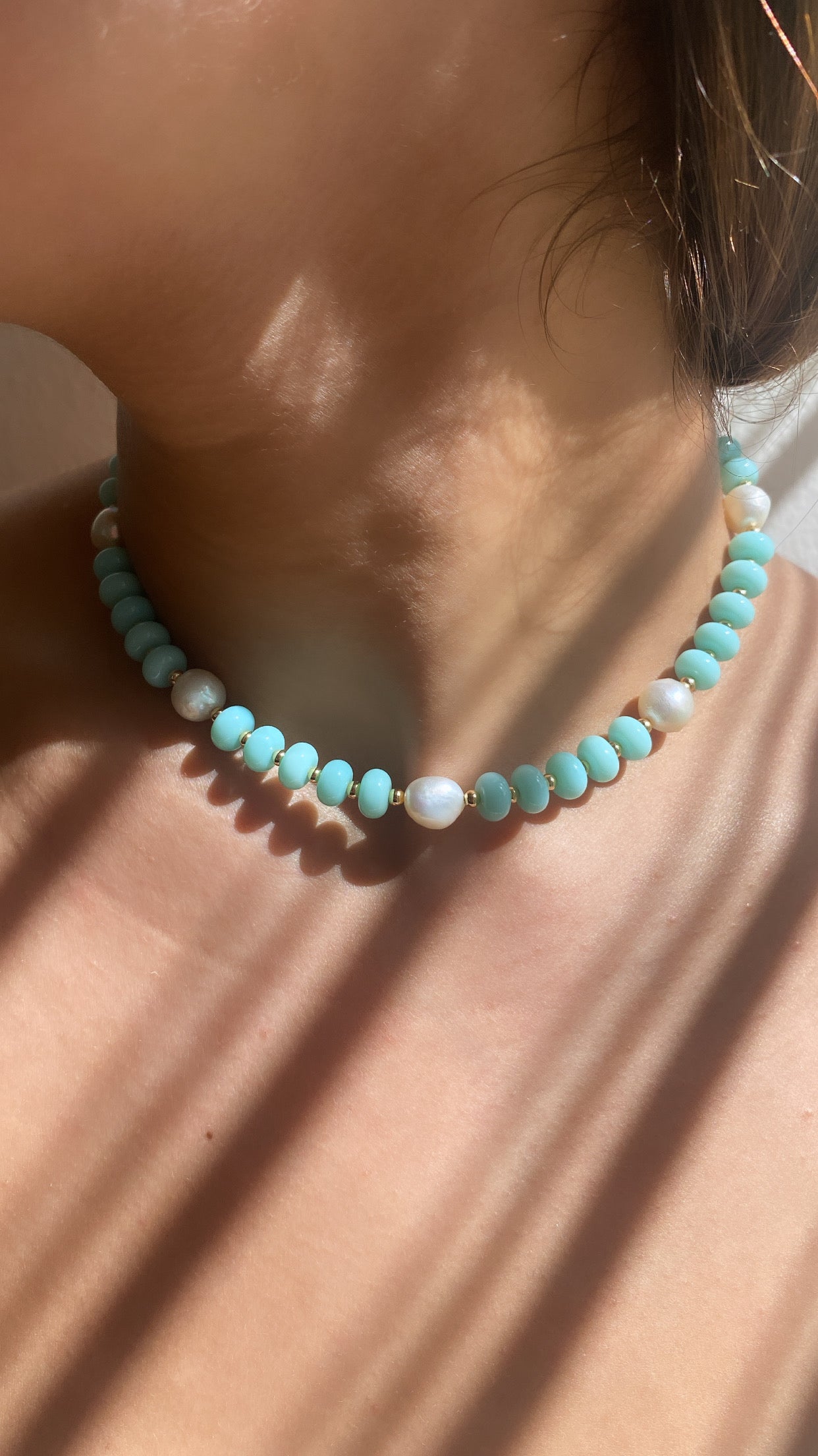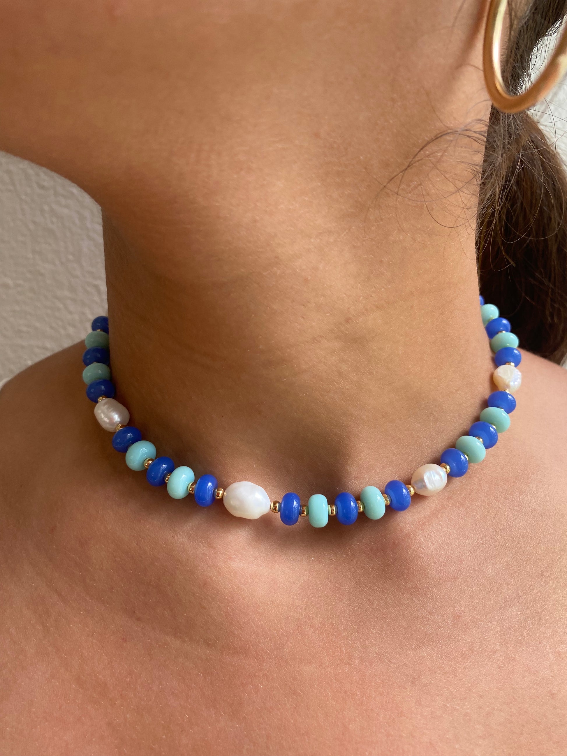 Glass beads, fresh water pearls and 18k gold plated spacers.