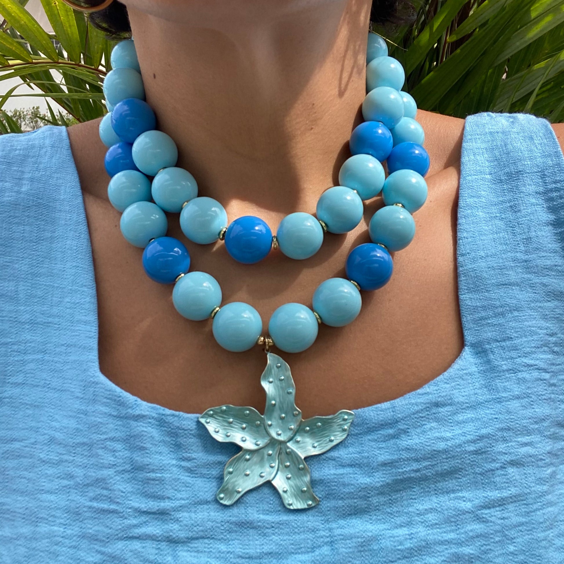 Resin beads and removable 18k rack plated enameled pendant. Shortest necklace Measures 17” long and brings a 2” chain extender.