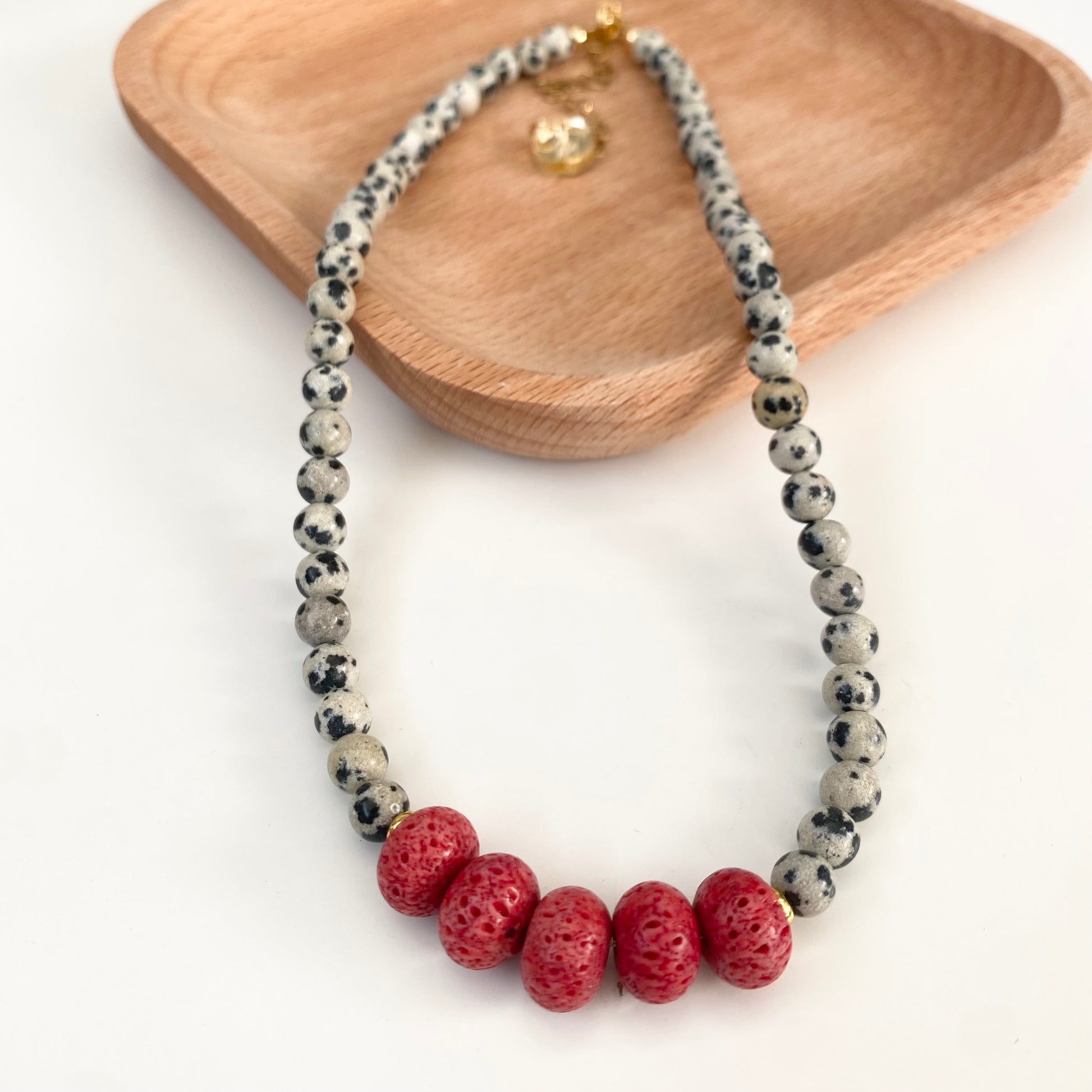 Dalmatian Jasper and Sponge Coral. Measures 15” Long with 2” Chain Extender.