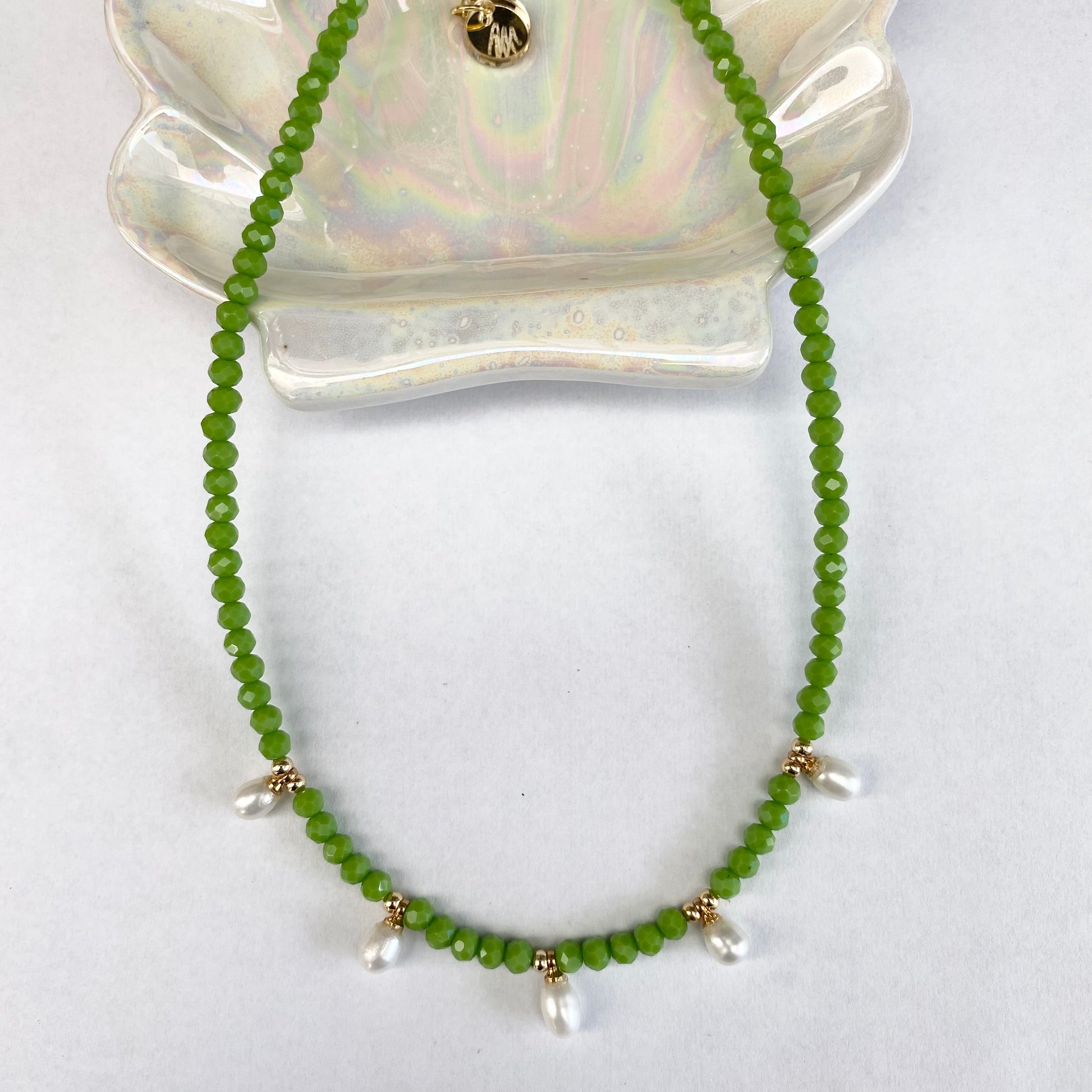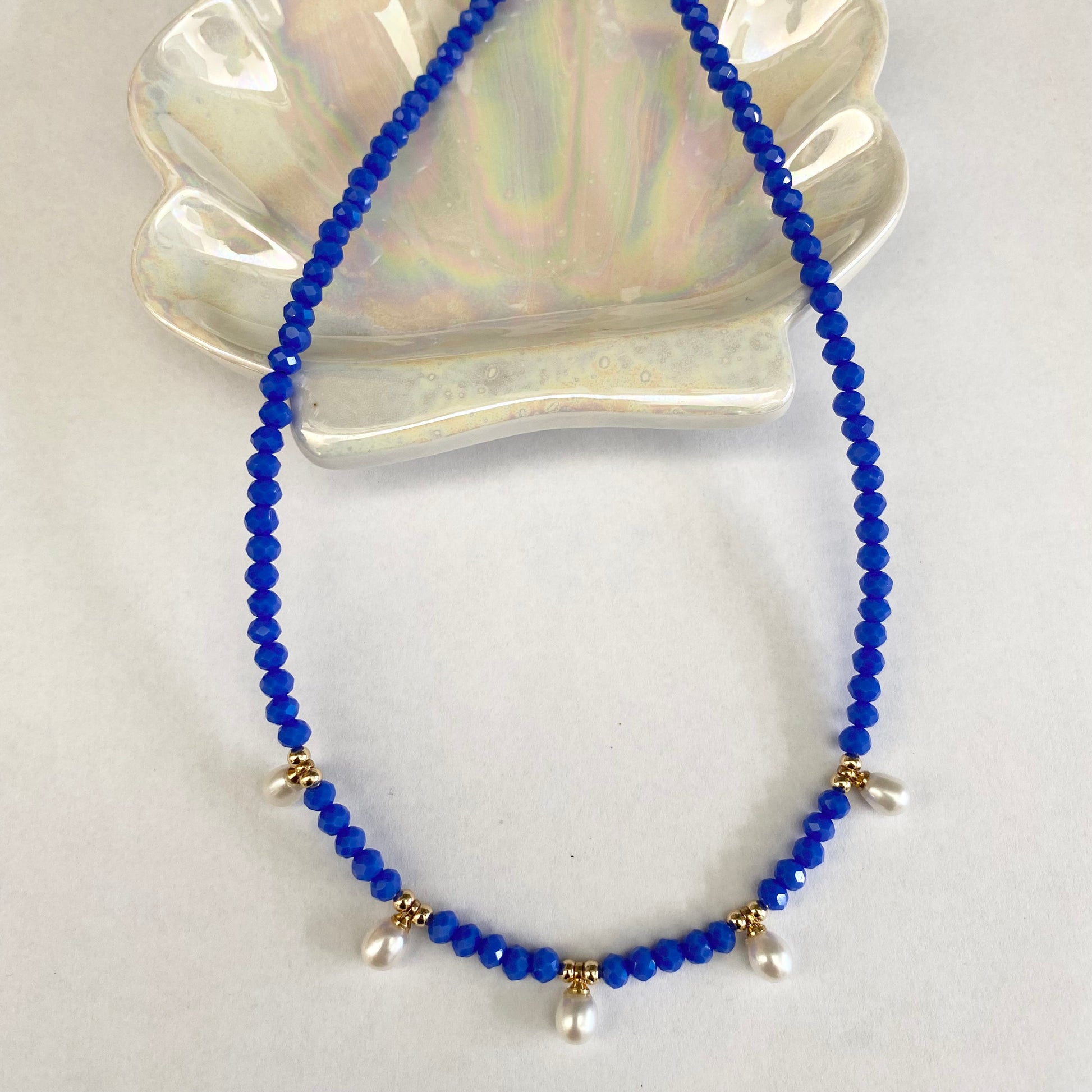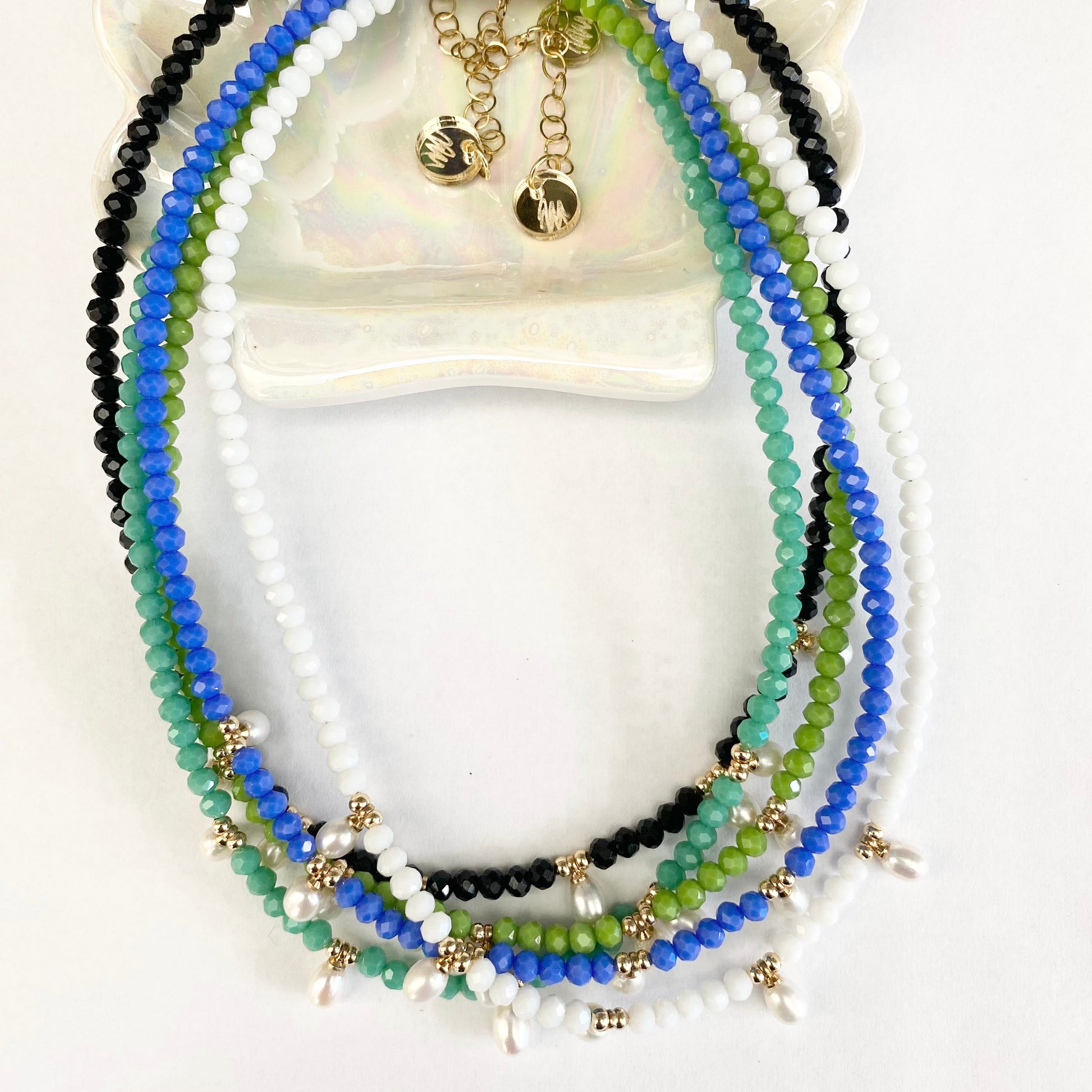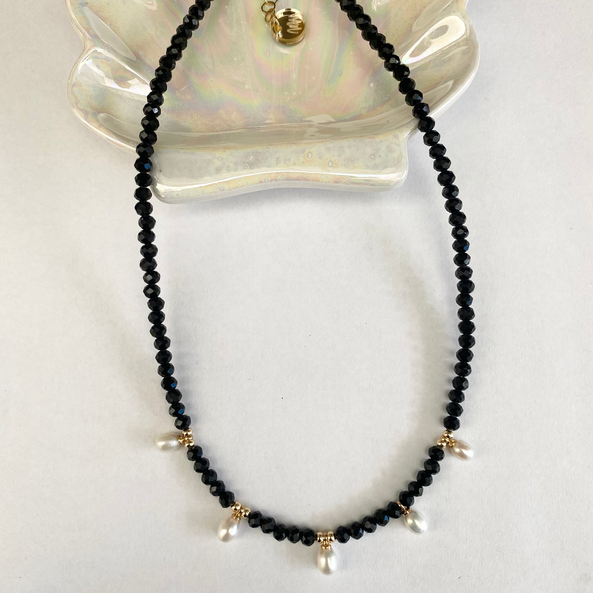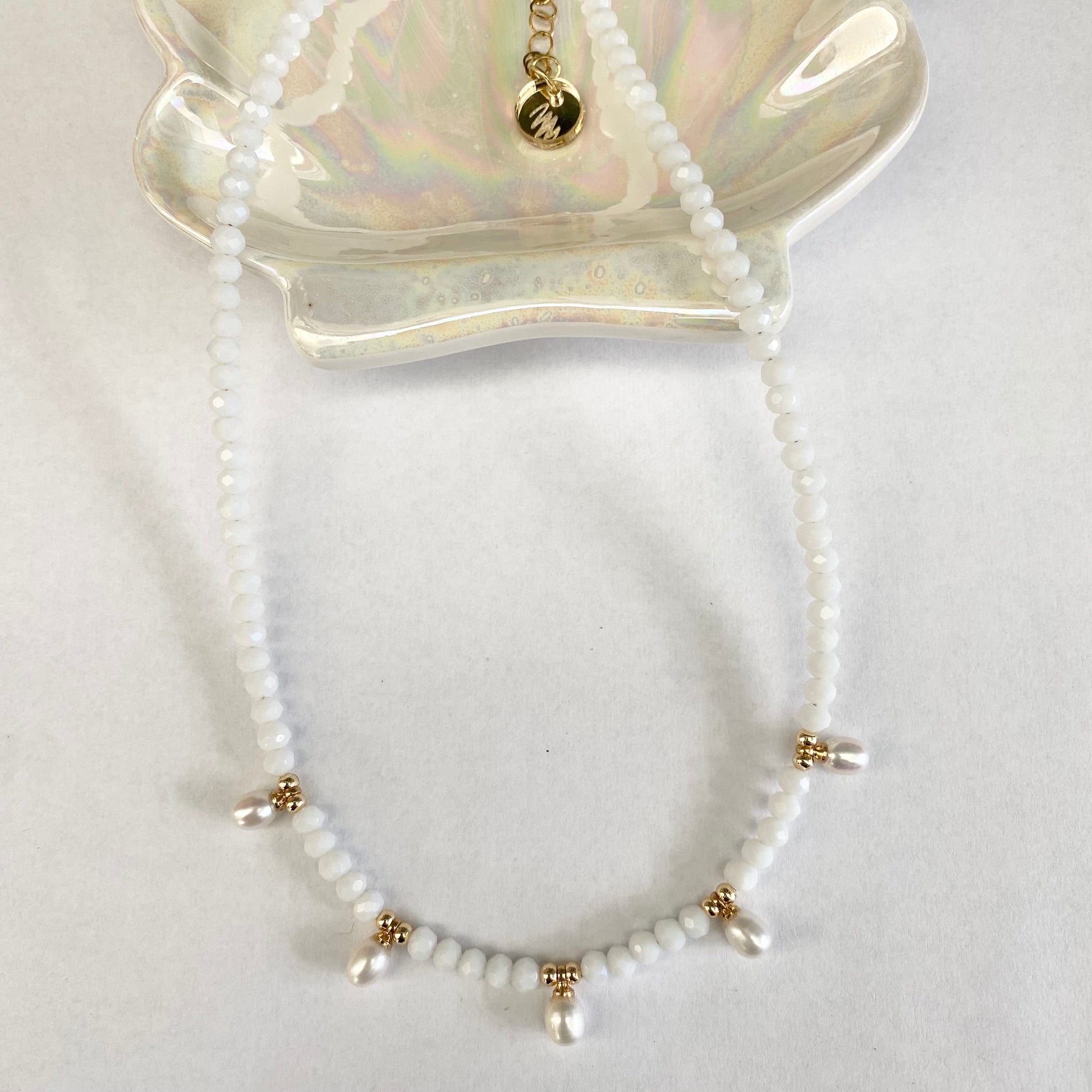 Faceted crystal beads and fresh water pearls, measures 15.5” long with 2” chain extender.