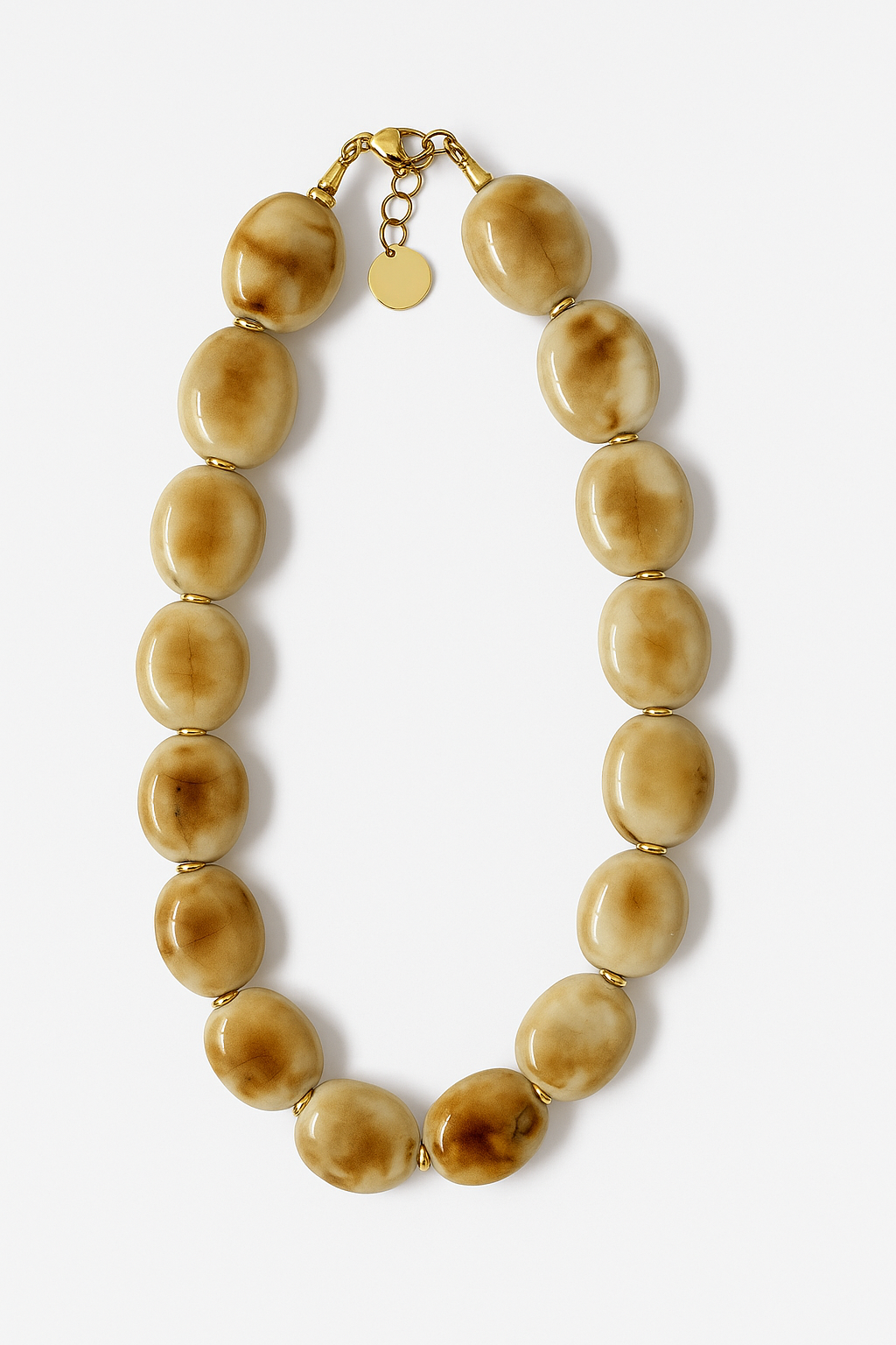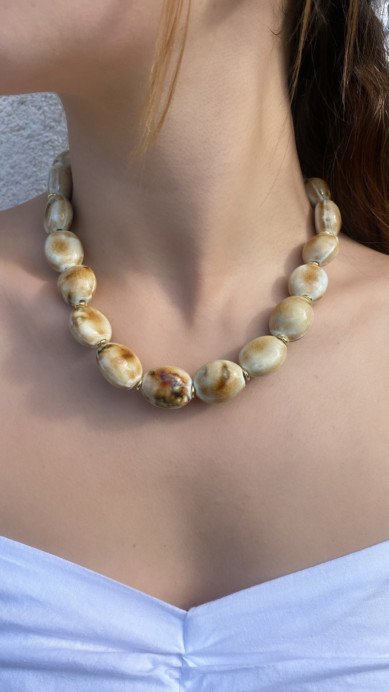 Handmade ceramic beads and 18k gold plated stainless steel. Measures 17” long with 2” chain extender.