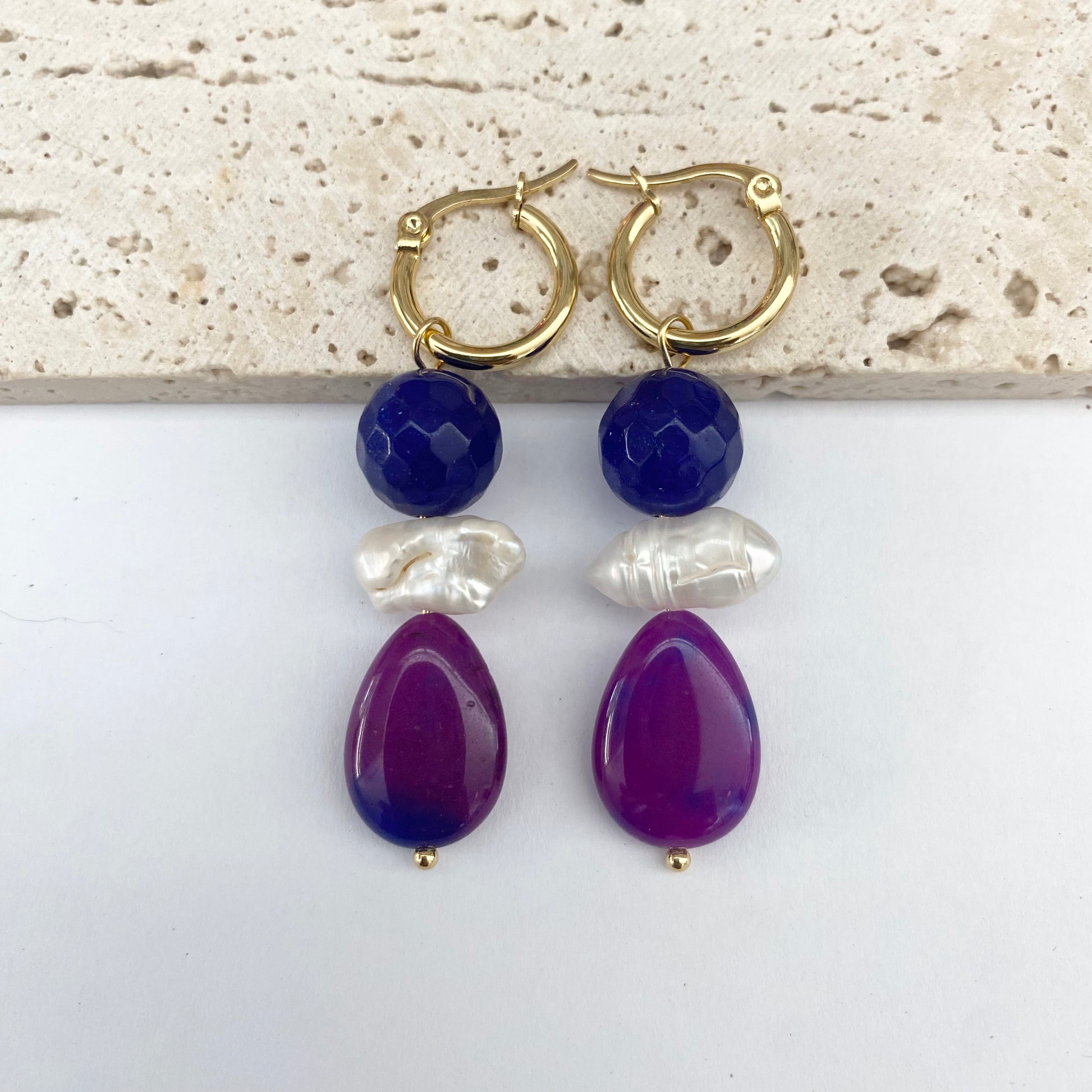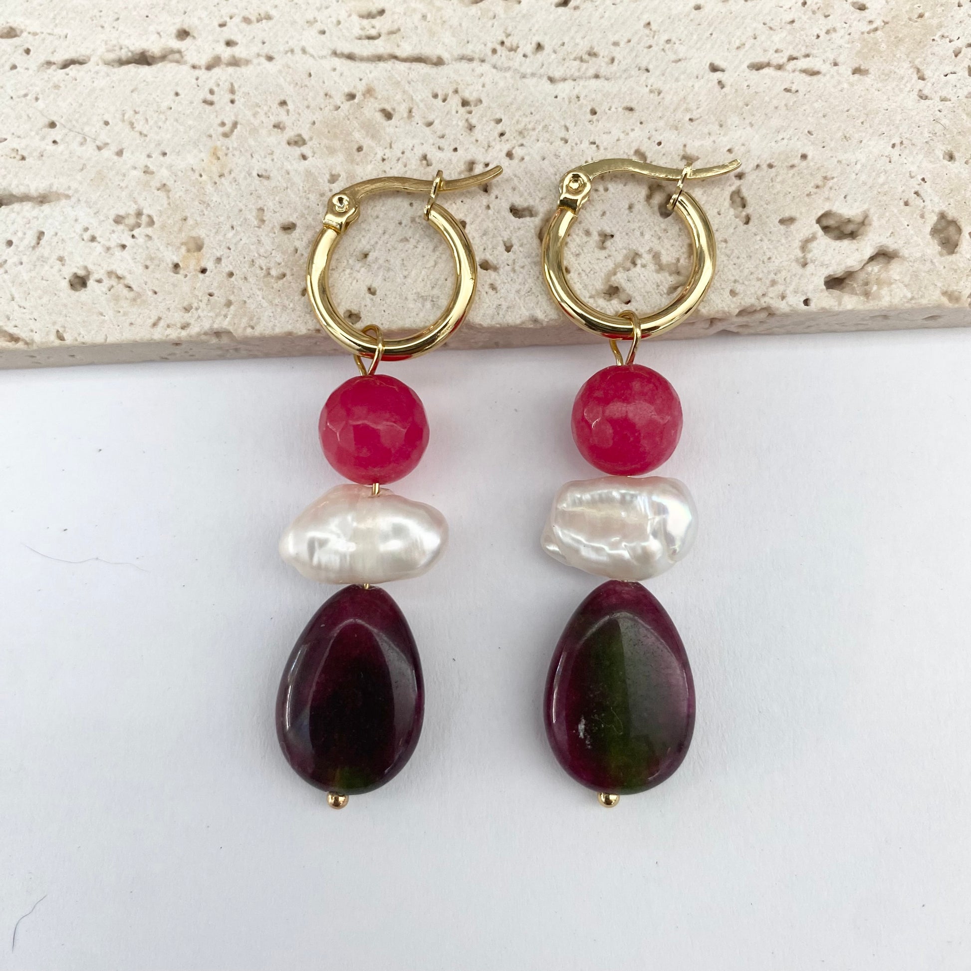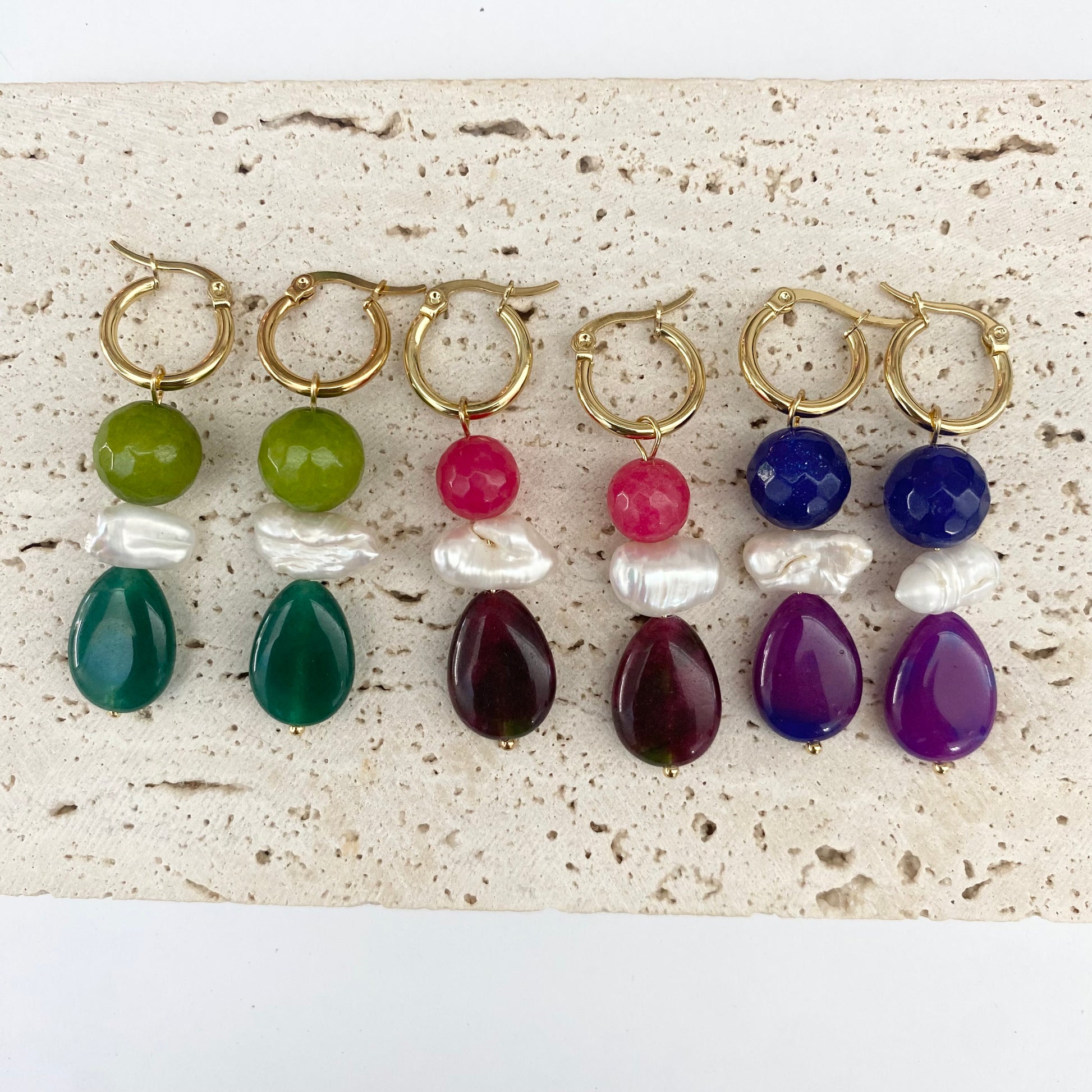 Agate, Pearl and Jade Earrings. Hoops are Stainless Steel