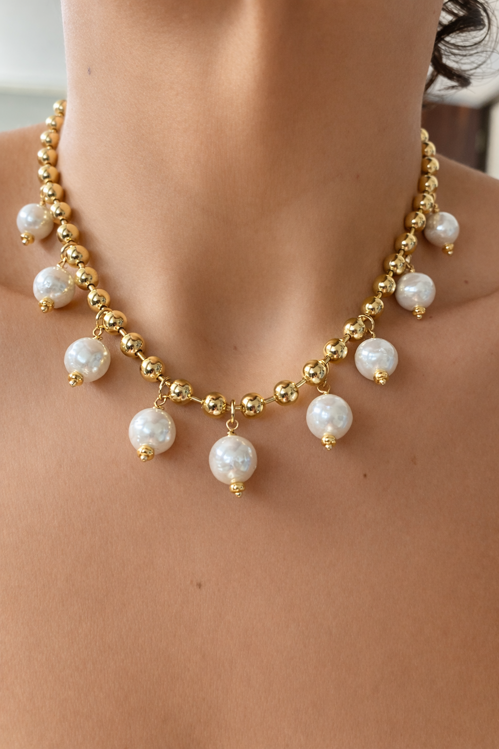 18k gold rack plated chain with natural pearls , measures 16.5” long with 2” chain extender.