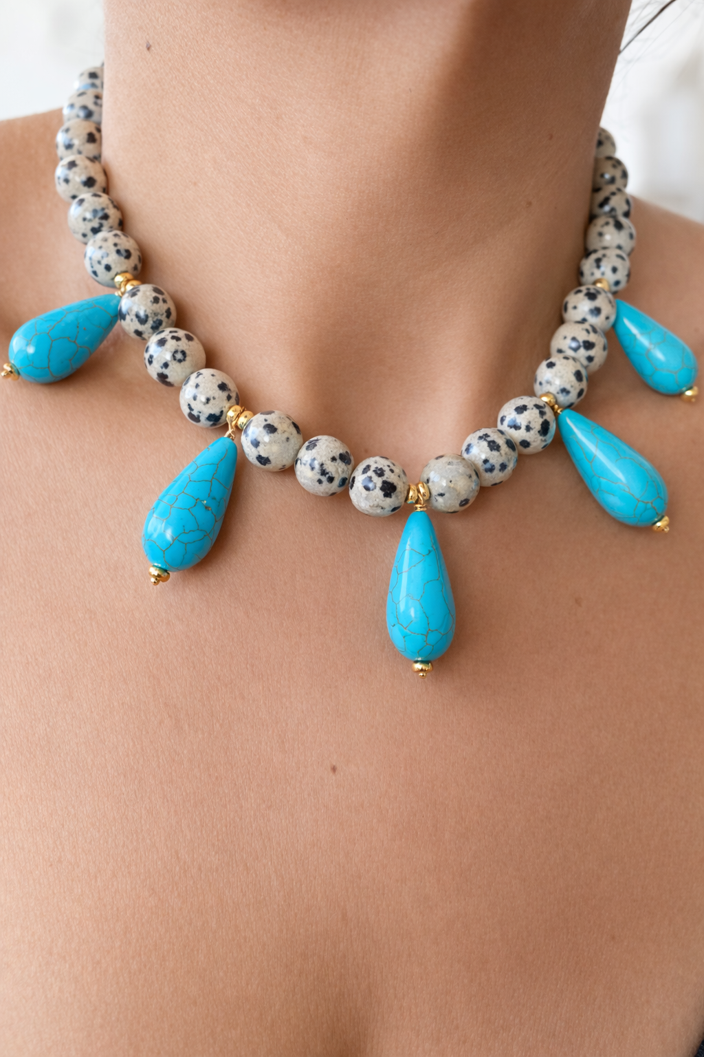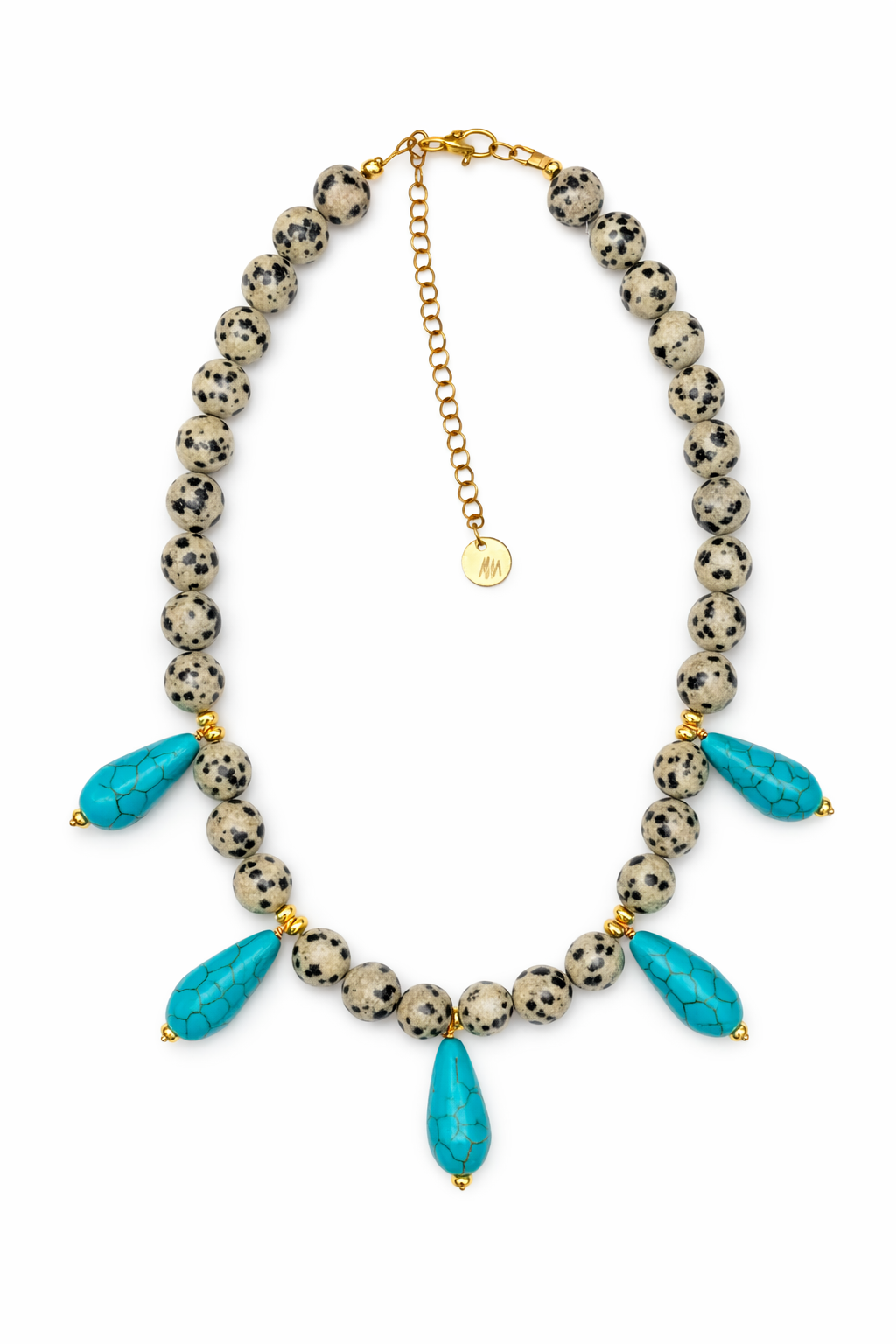Natural Dalmatian Jasper and Howlite Beads. measures 16” Long with 2” Chain Extender.