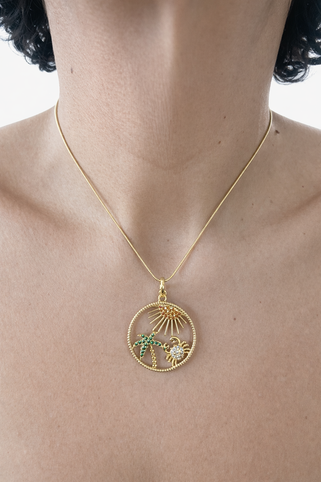 18K Rack Plated Brass Chain and Pendant with Cubic Zirconia Details. Measures 16.5” Long with 1” Chain Extender.