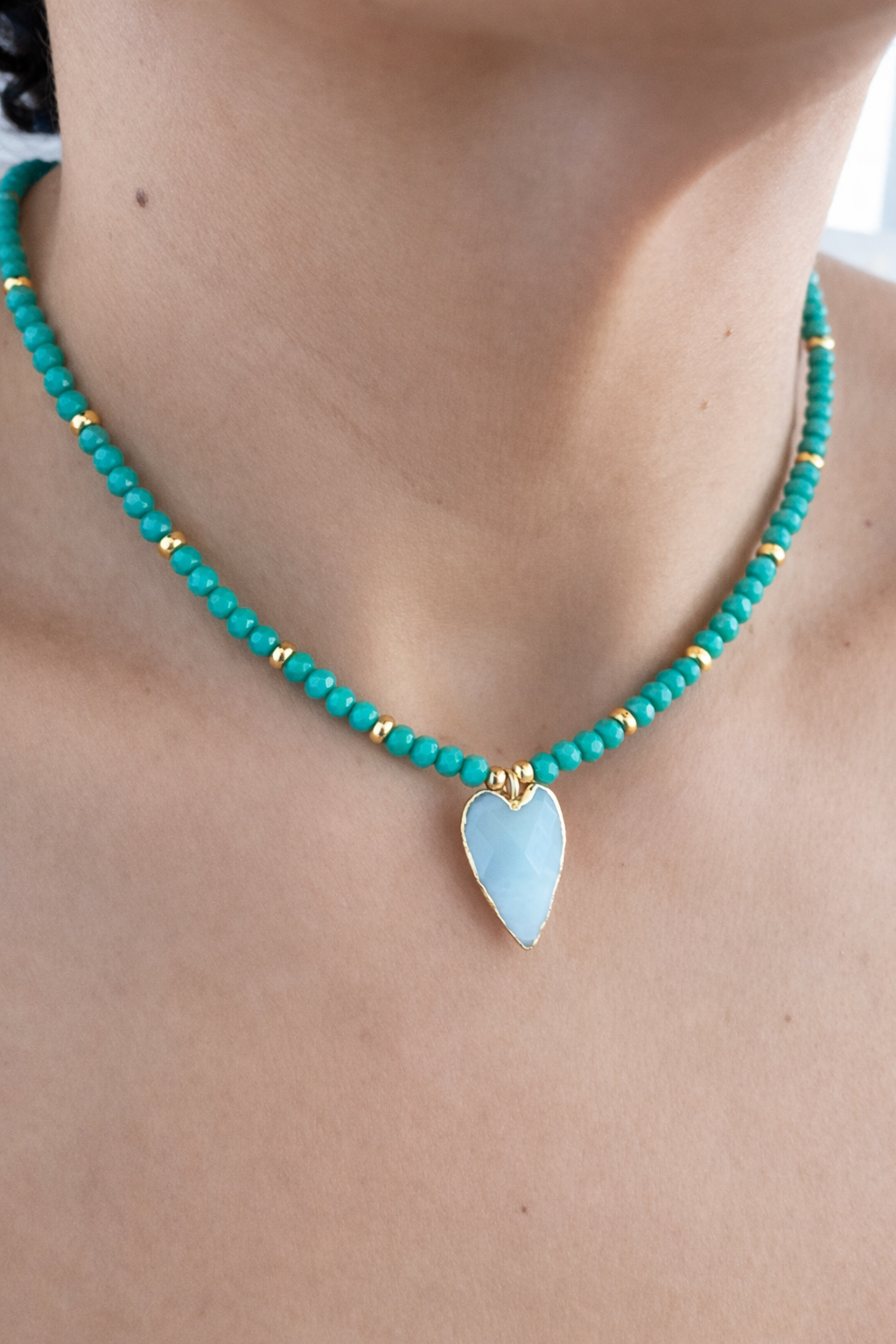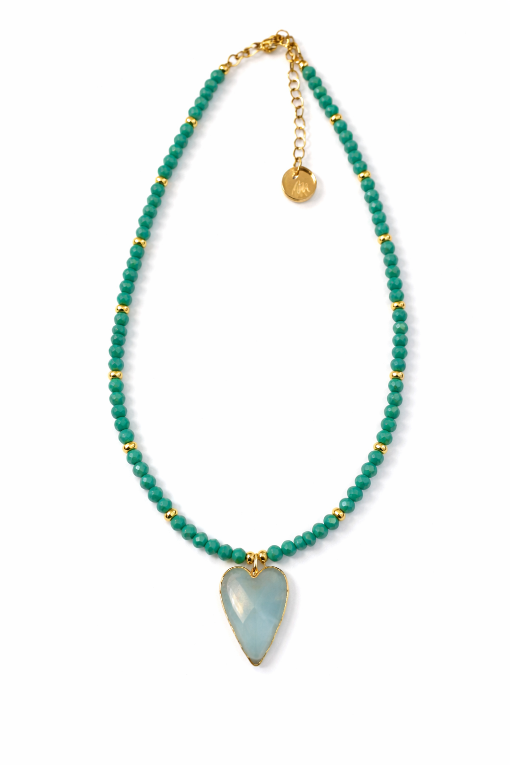Faceted Crystal Beads and Amazonite Stone Heart, Measures 16” Long with 2” Chain Extender.