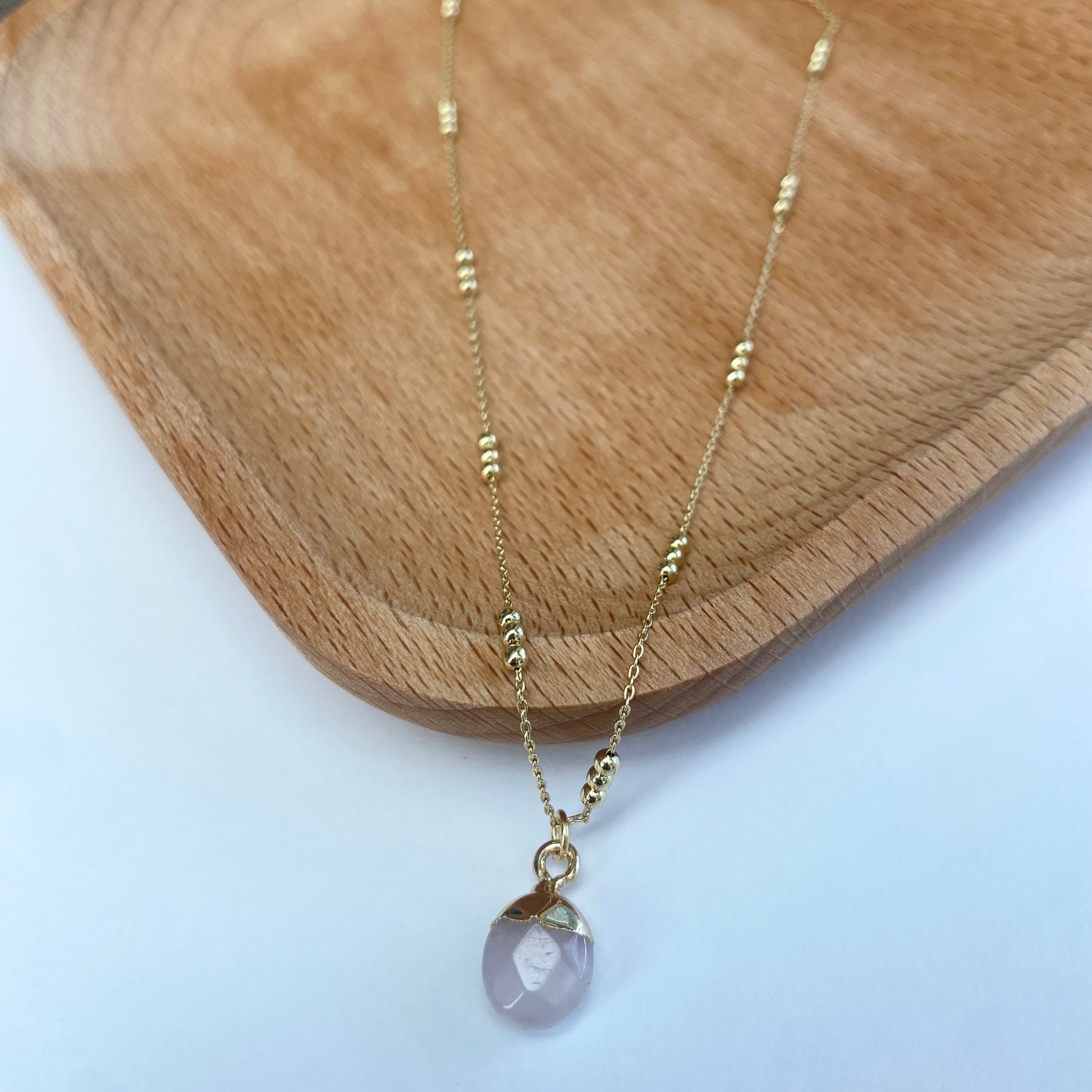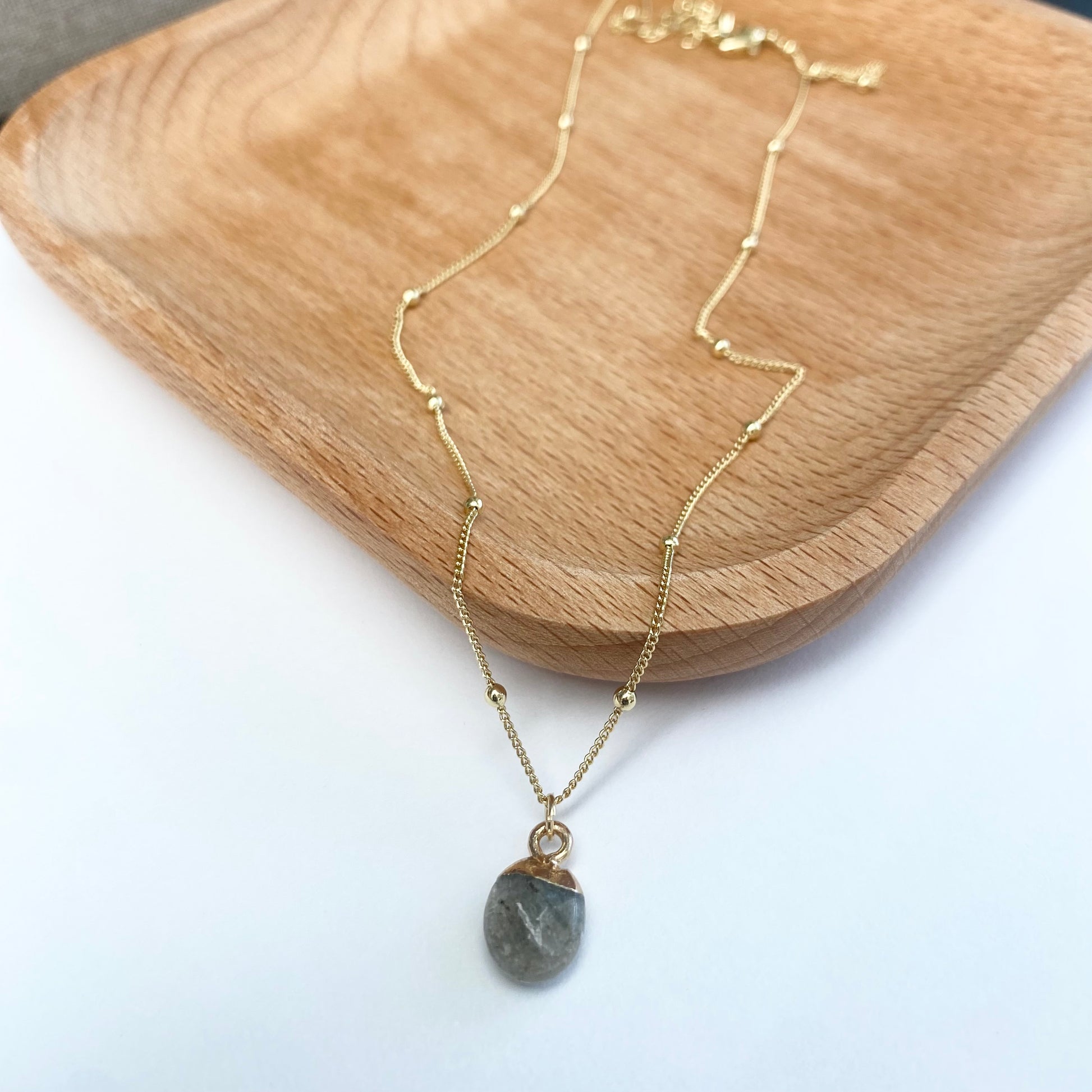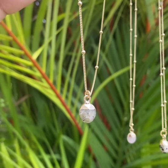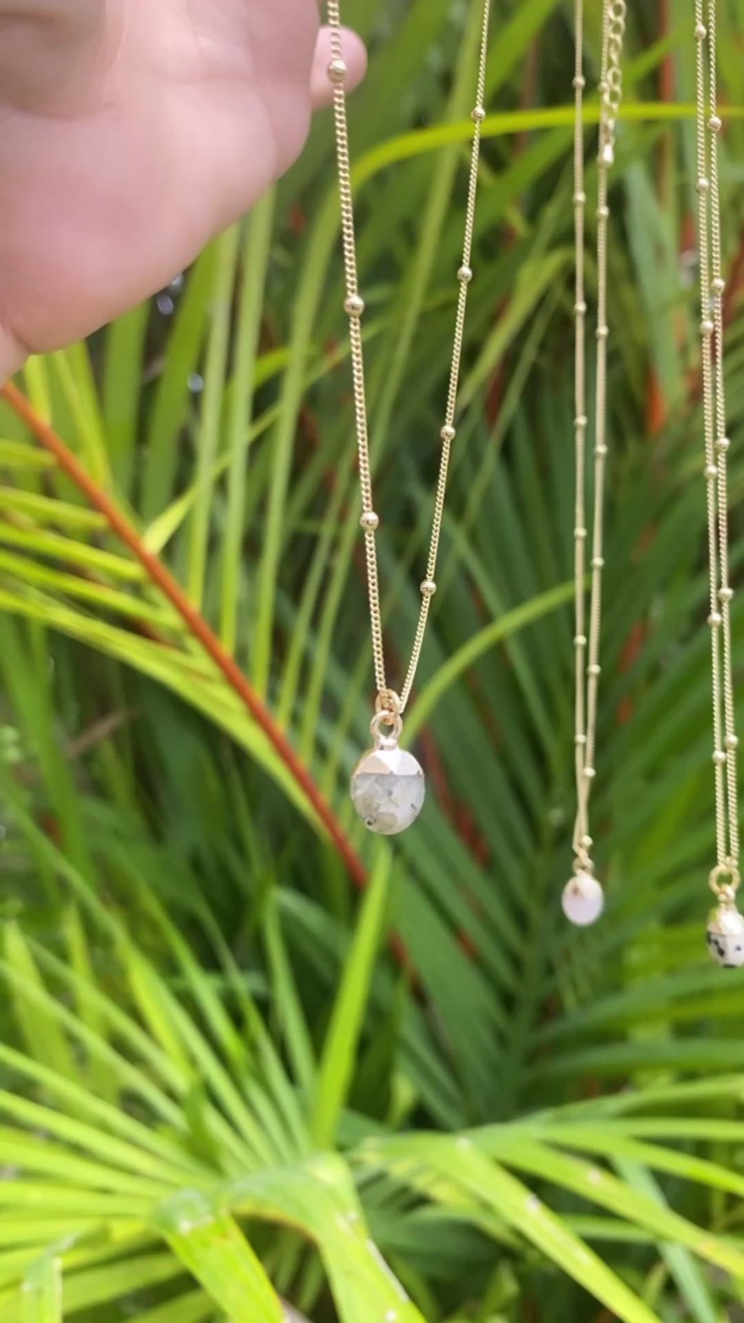 18k gold plated chain, measures 16.5” long with 1” chain extender. Choose from Rose Quartz, Dalmatian Jasper or Labradorite.