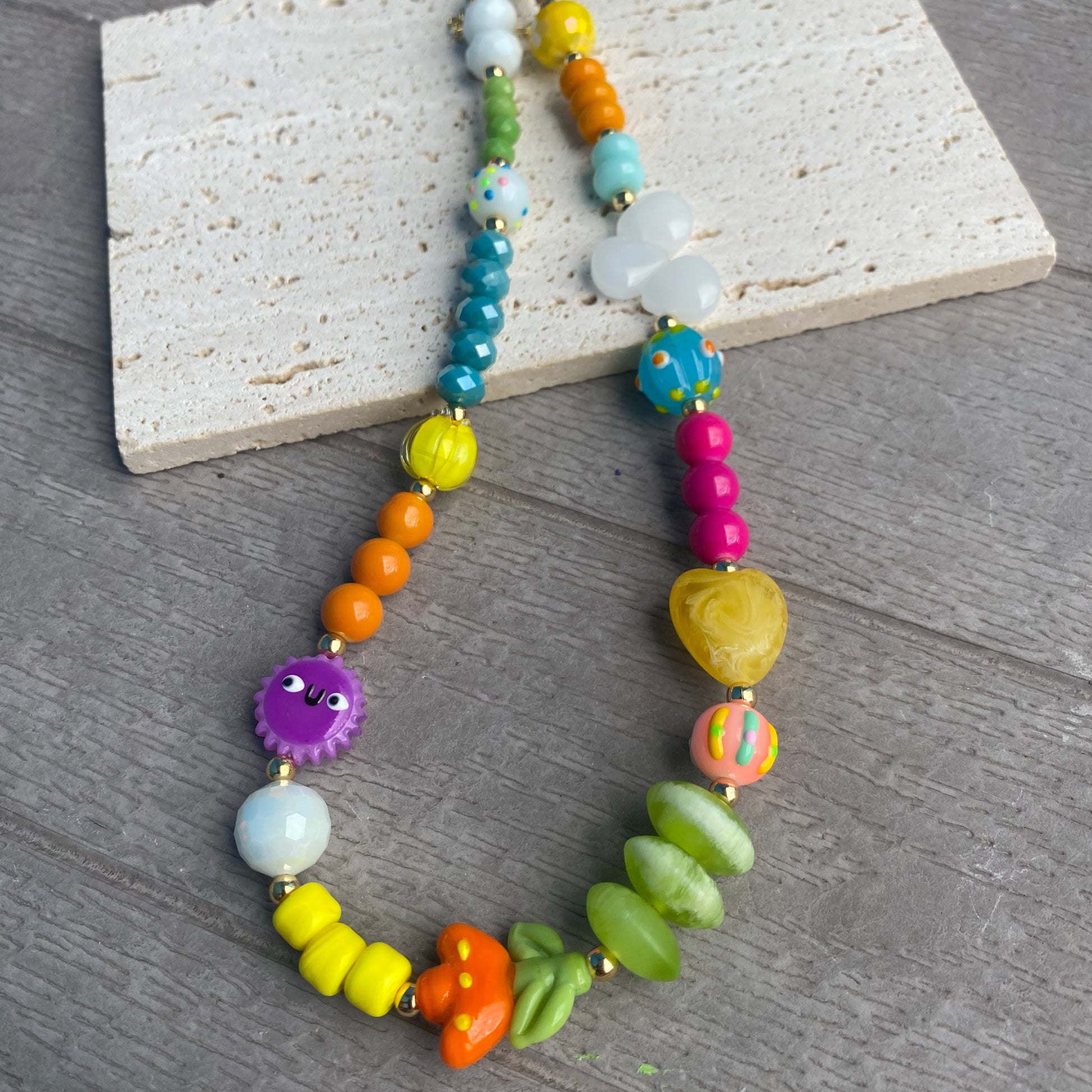 Mix of Resin and Lampwork Crystal Beads, Measures 15” Long with 2” Chain Extender.
