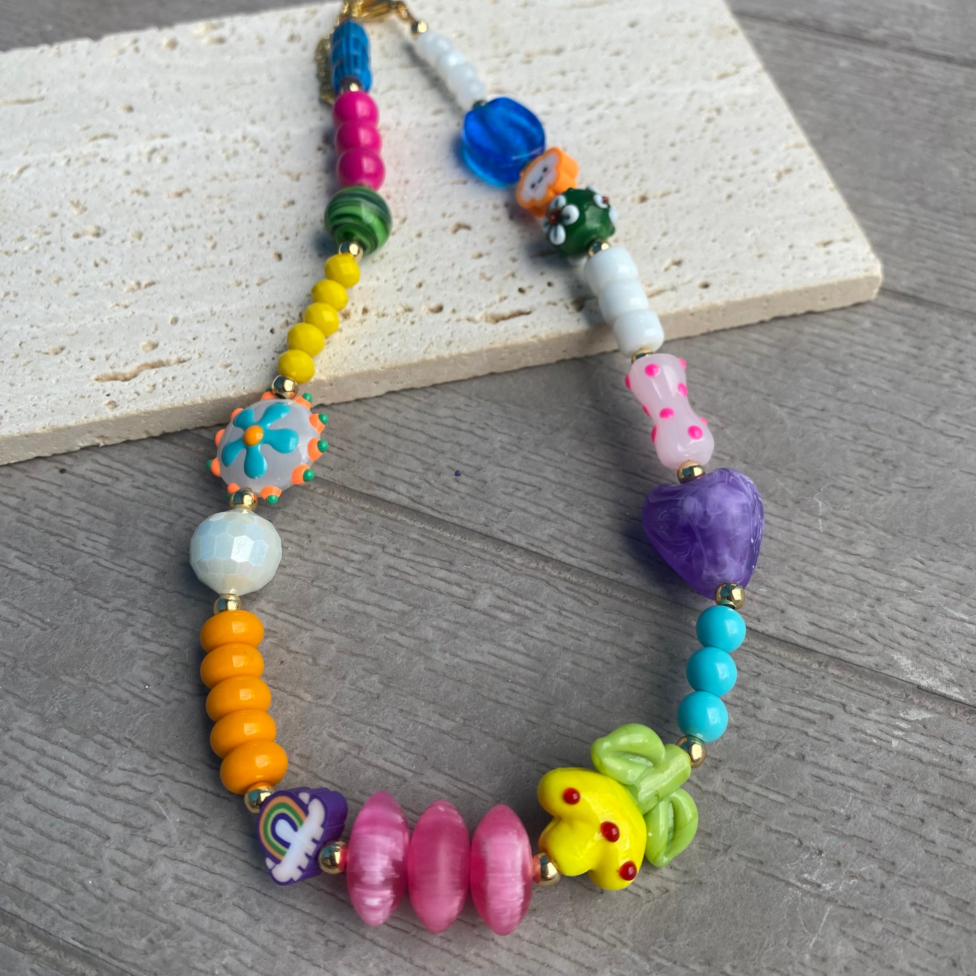 Mix of Resin and Lampwork Crystal Beads, Measures 15” Long with 2” Chain Extender.